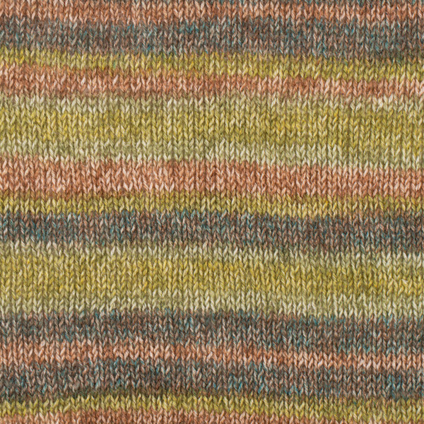Tejer con menos puntos (como en calcetines) produce un efecto jaspeado más definido. En superficies más grandes, las secuencias de color se hacen más largas y fluidas. Usa el hilo para crear proyectos coloridos sin tener que cambiar de ovillo durante el trabajo. Como el hilo se tiñe con una técnica especial de “fancy dyeing”, pueden producirse pequeñas variaciones de color y patrón entre los lotes. Esto contribuye a la expresión única del hilo.