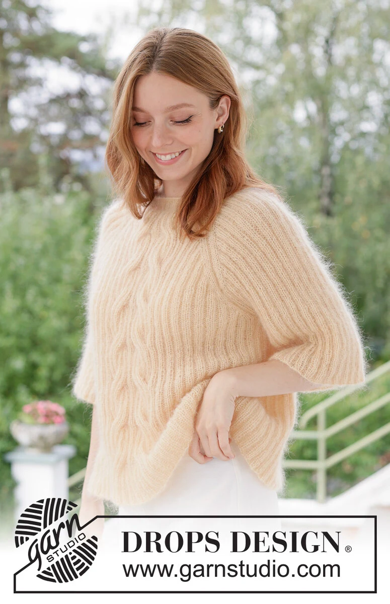 Jersey de punto en 2 hilos DROPS Kid-Silk. La pieza está tejida de arriba hacia abajo con raglán, torsadas y resorte. Tallas XS – XXXL.