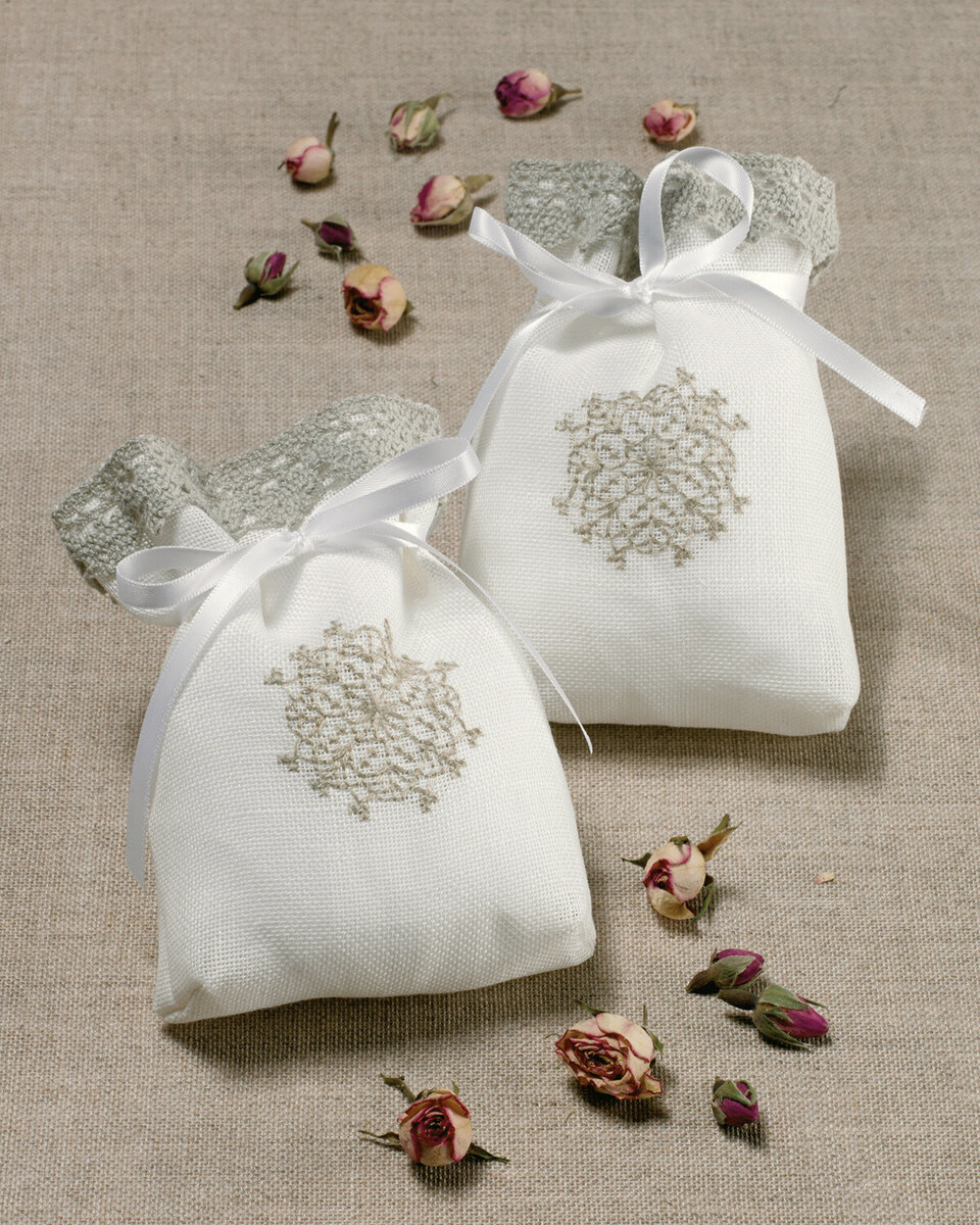 - Se borda con punto de cruz y puntada de tallo utilizando hilo DMC Mouliné para un acabado atemporal.