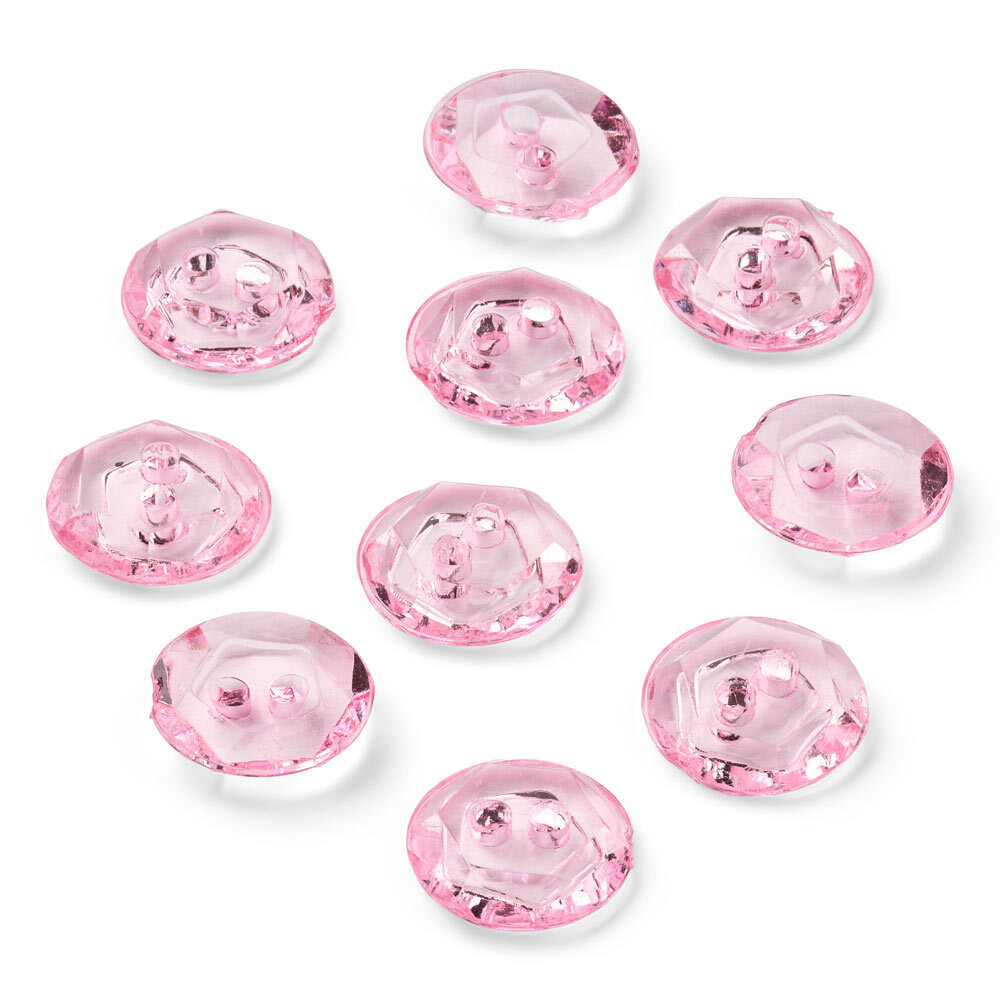Estos botones de cristal rosa de LindeHobby miden 12 mm de diámetro y vienen en un paquete de 10 unidades. Están hechos de plástico transparente con una superficie facetada que proporciona un brillo sutil y color.