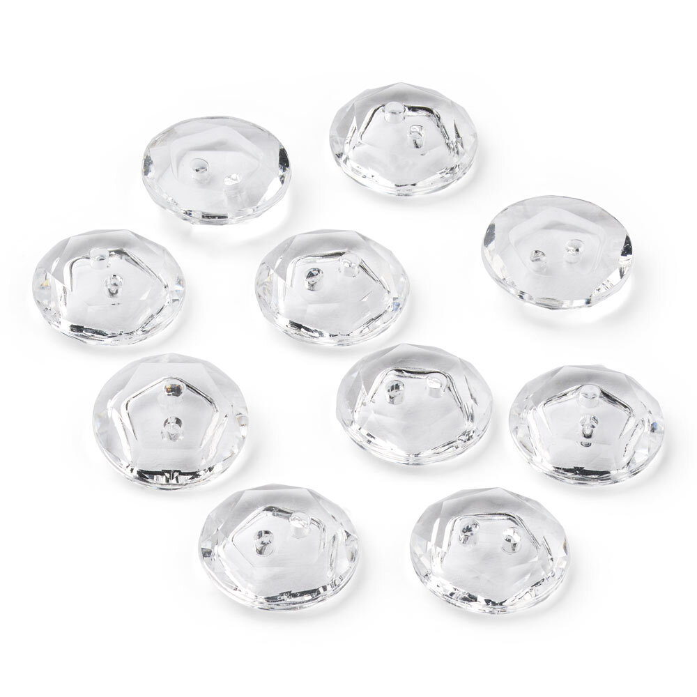 Un set de 10 botones de cristal transparente de plástico, cada uno con un diámetro de 12 mm. La superficie facetada capta la luz de forma hermosa y añade un toque elegante a tus proyectos.