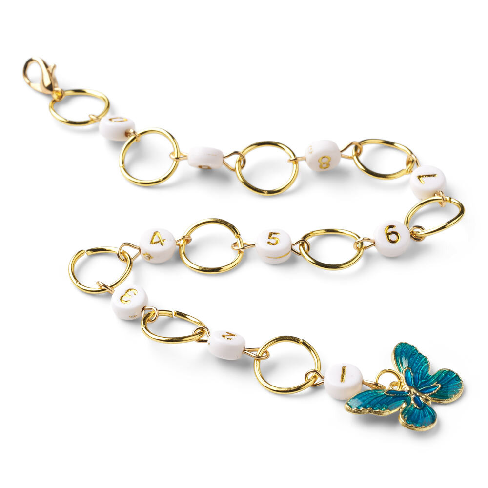 El contador de vueltas de LindeHobby es una herramienta estética e inteligente que te ayuda a llevar la cuenta de tus vueltas y puntos al tejer o hacer ganchillo. Está compuesto por una cadena con cuentas blancas numeradas del 0 al 9, unidas con anillos metálicos dorados. La cadena termina con una mariposa turquesa decorativa y es apta para agujas y ganchillos de hasta 9.00 mm.