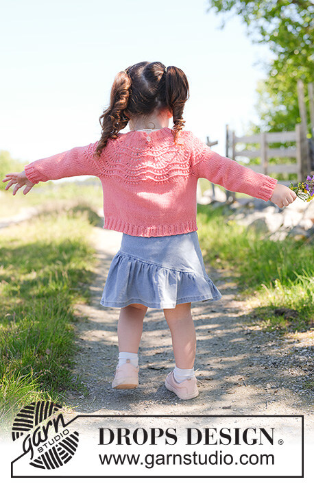 Jersey de punto para niños en DROPS Safran. La pieza está tejida de arriba hacia abajo con canesú redondo y patrón de ondas. Tallas 2 – 12 años.